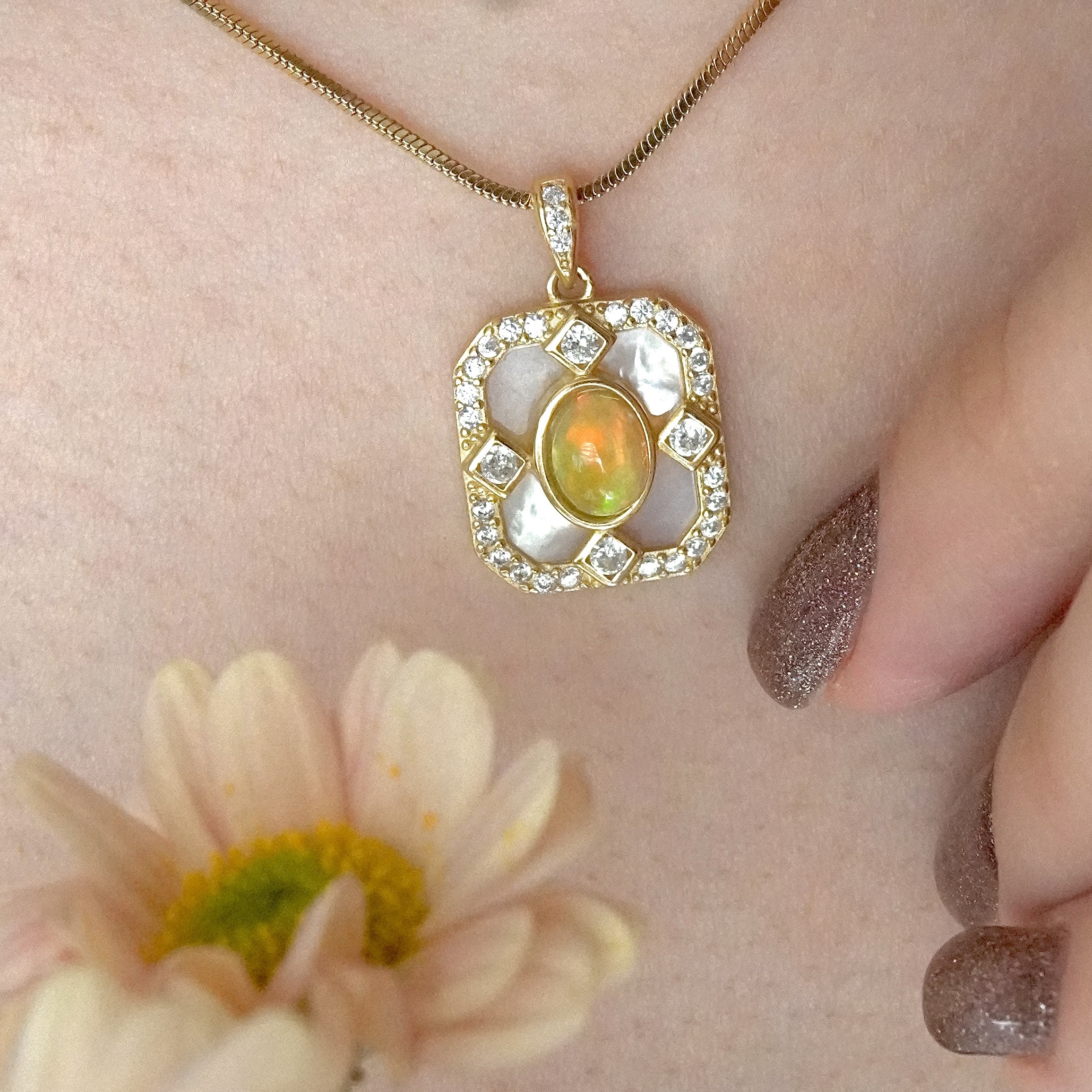 مدال جواهری زنانه و دخترانه سنگ اوپال و صدف طبیعی |نقره با ابکاری درجه یک