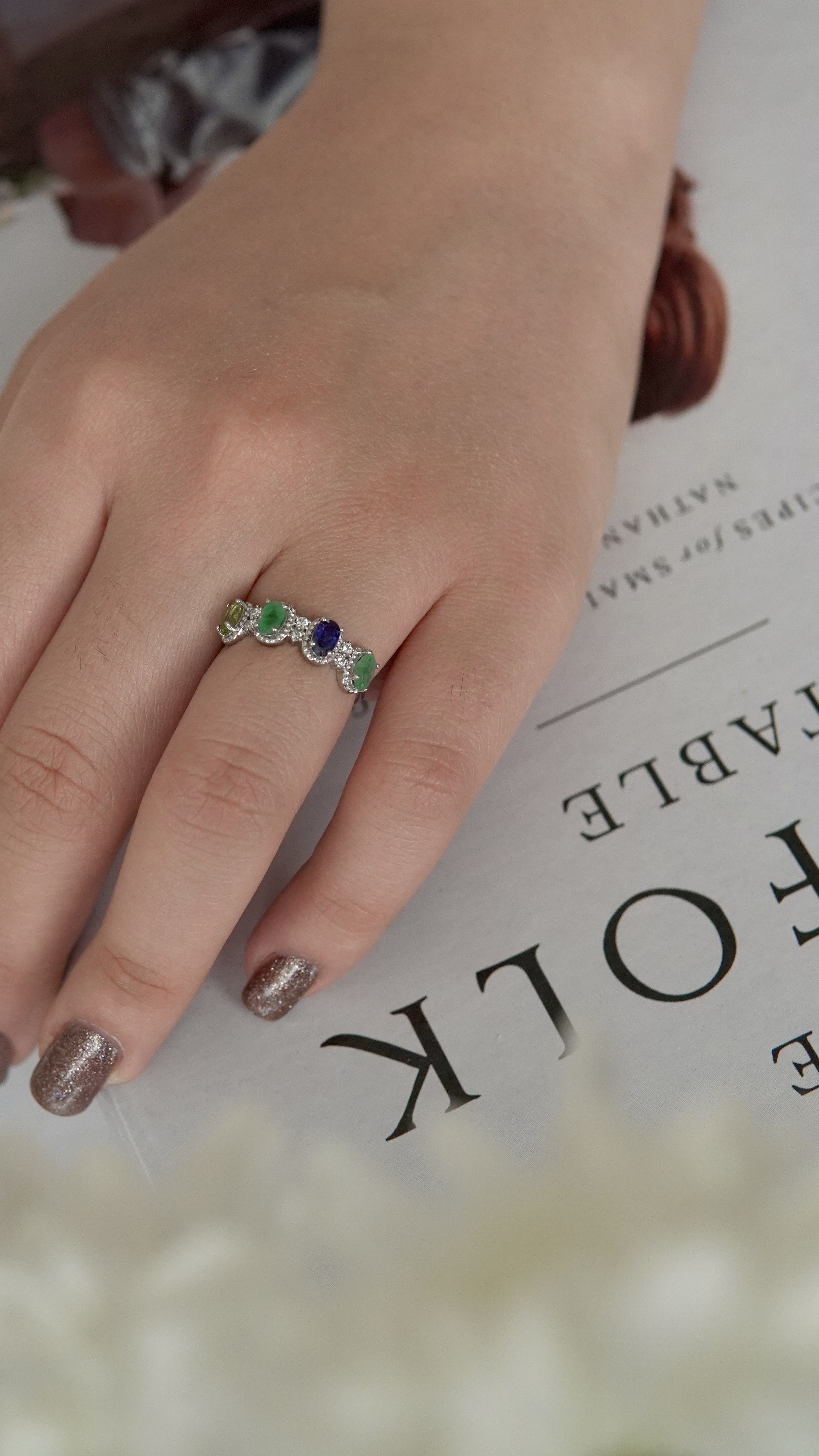 این انگشتر با گوهرهای طبیعی زمرد، زبرجد و کیانیت طراحی شده و هر سنگ با ظرافت روی پایهای از نقره آبکاری درجه یک قرار گرفته تا جلوهای متفاوت و چشمگیر ایجاد کند.