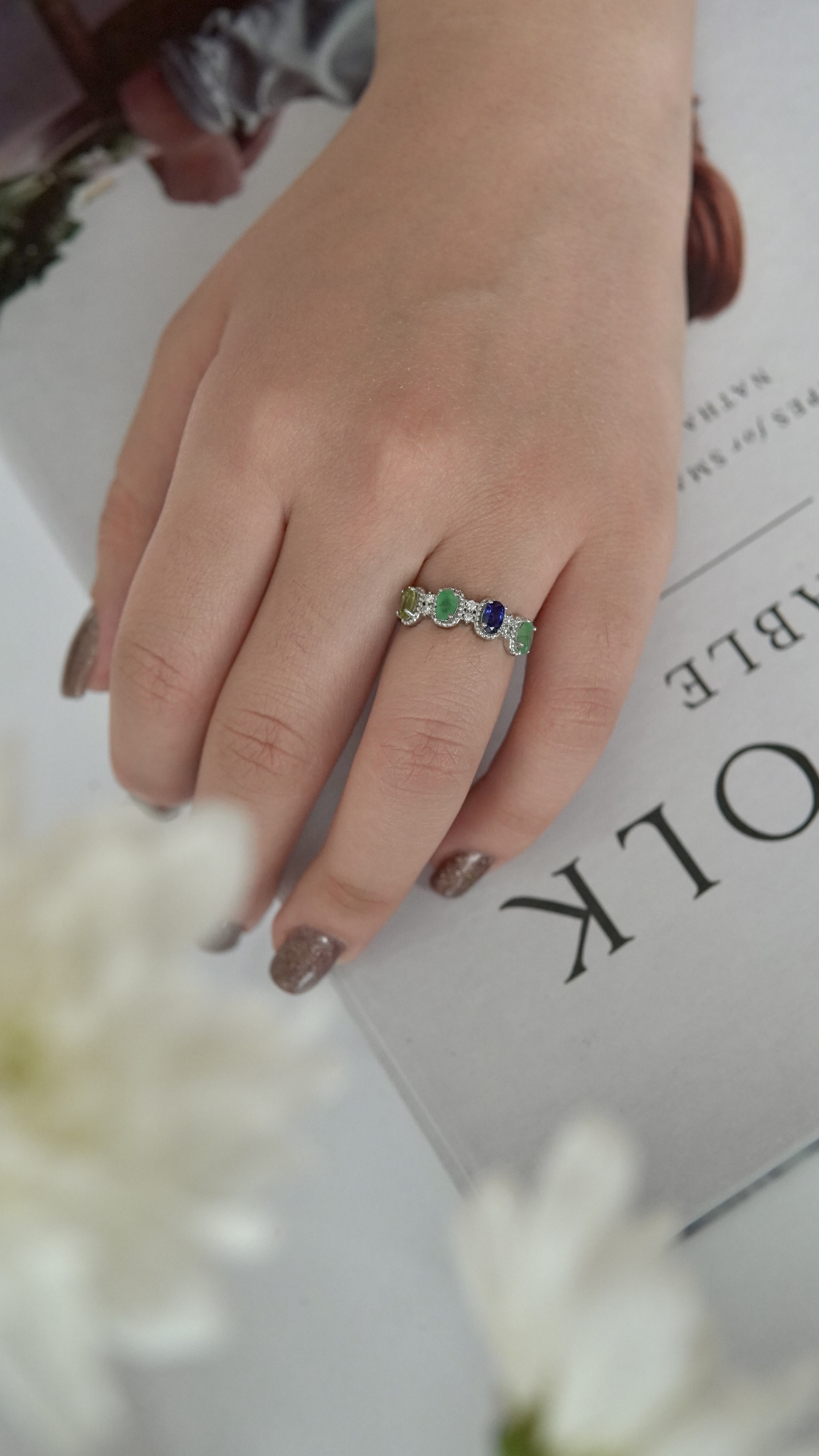 انگشتر نقره زنانه و دخترانه جواهری با سنگهای طبیعی زمرد، زبرجد و کیانیت | نقره آبکاری درجه یک | شناسنامه و فاکتور اصالت از لیا گالری