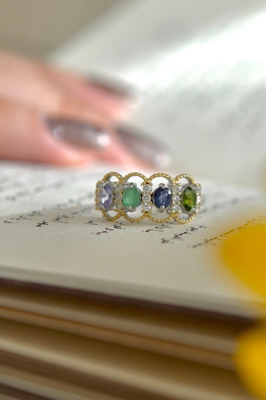 نوع محصولانگشتر جواهری زنانه و دخترانه با سنگ های طبیعی آمیتیس و زمرد و کیانیت و کروم دیوپساید | پایه نقره با آبکاری دو رنگ درجه یک کپی کپی