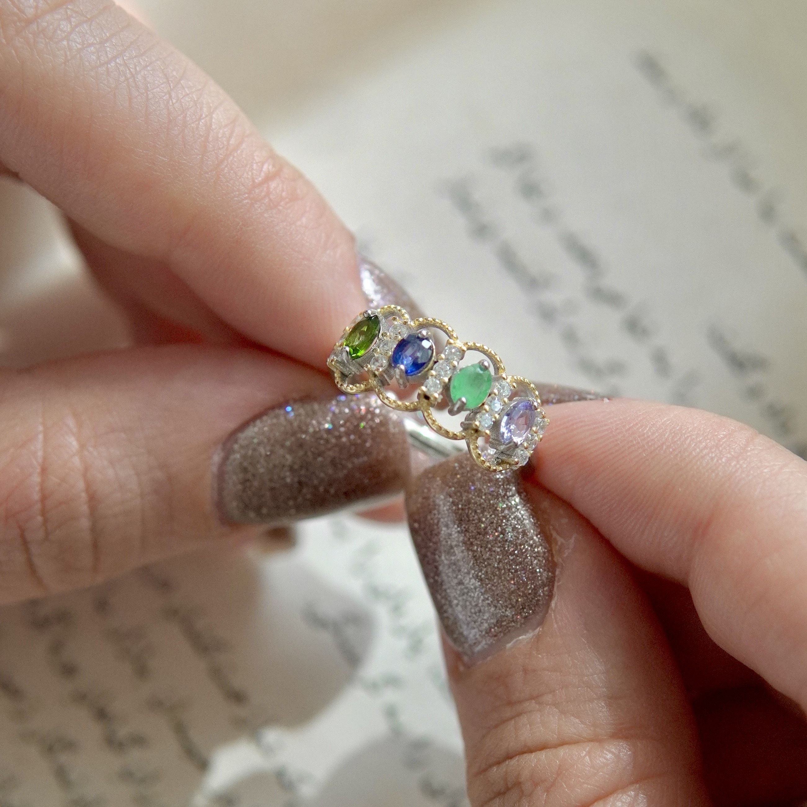 نوع محصولانگشتر جواهری زنانه و دخترانه با سنگ های طبیعی آمیتیس و زمرد و کیانیت و کروم دیوپساید | پایه نقره با آبکاری دو رنگ درجه یک کپی کپی