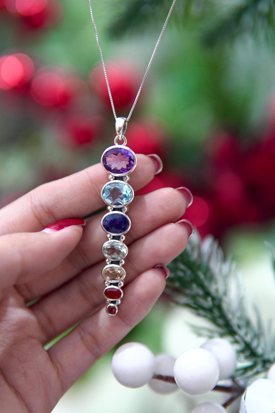 مدال اسپرت هفت چاکرا زنانه و دخترانه مدل هرم انرژی با پایه نقره و سنگ های طبیعی تراش بیضی