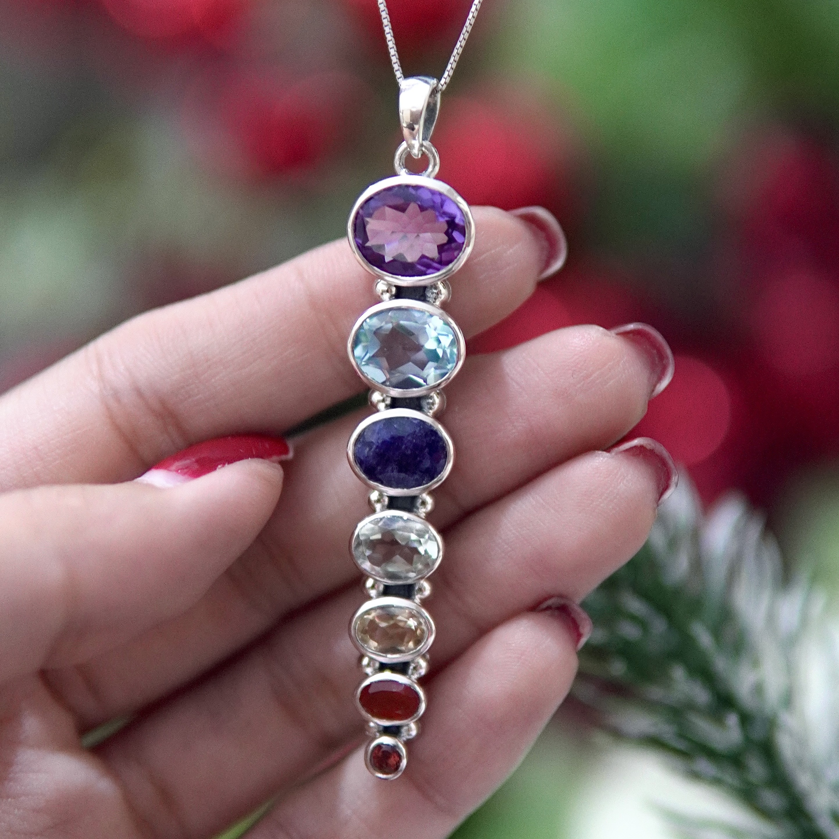 مدال اسپرت هفت چاکرا زنانه و دخترانه مدل هرم انرژی با پایه نقره و سنگ های طبیعی تراش بیضی
