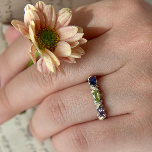 انگشتر جواهری زنانه و دخترانه با سنگ های طبیعی آمیتیس و زمرد و کیانیت و کروم دیوپساید | پایه نقره با آبکاری دو رنگ درجه یک