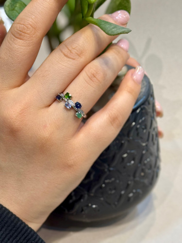 انگشتر جواهری زنانه و دخترانه با سنگ های طبیعی زمرد و یاقوت کبود و زبرجدو تانزانایت و کروم دیوپساید | پایه نقره با آبکاریدرجه یک